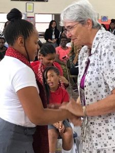 This is the first school-wide event of the academic year. The 5th grade is officially welcomed into the school at a ceremony where the 6th, 7th, and 8th graders deliver greetings through song, dance, and speech. Each 5th grader receives a stole, specifically made for that class, from the President. The stole is worn at special events during the time the student attends Sisters Academy and becomes hers to keep on her graduation day fours year later. The ceremony concludes with a blessing from the Principal.